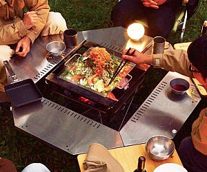 Set up an impromptu dining room virtually anywhere using the barbecue dining table. This sturdy table sets up around the specialized grill set – sold separately – to provide you and your friends with a sturdy surface you can use to eat or prepare meals on.